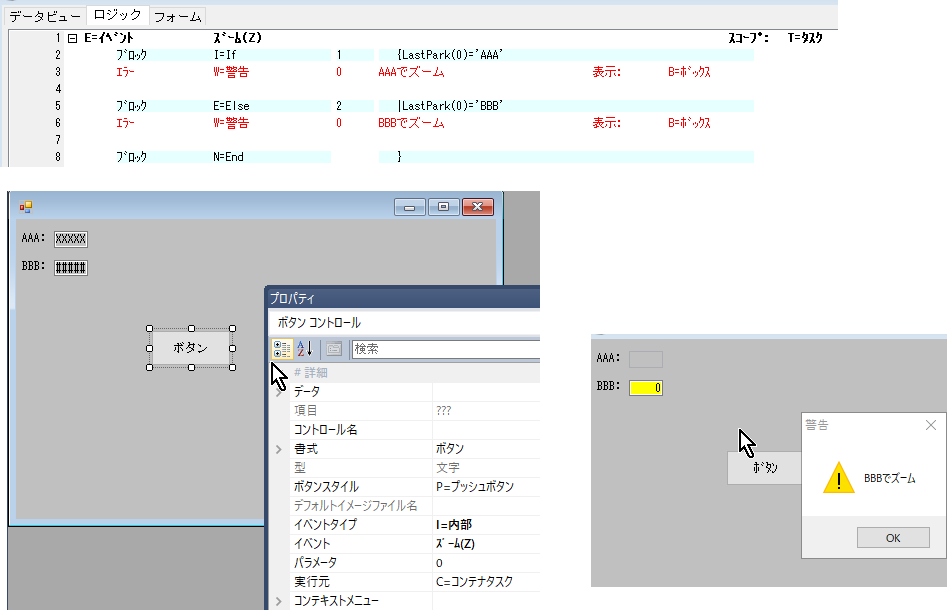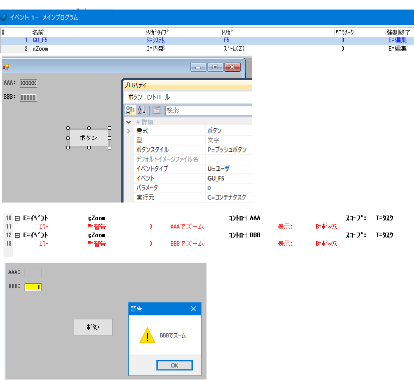 これで、ズーム操作(F5キー、ダブルクリック)とボタンコントロールでイベント実行できました。