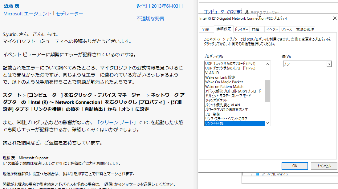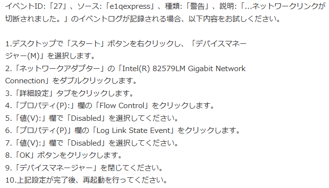 ネットワーク・リンクが切断されました。で検索して以下を施してみました。