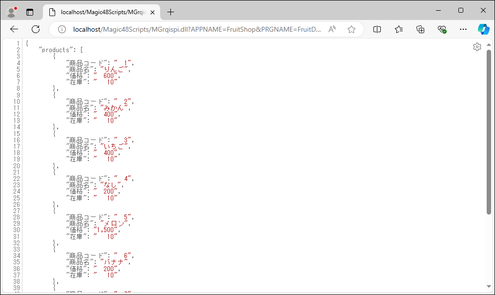 Magicが吐き出すJSONファイルを、ブラウザで受け取って表示しただけのスクリーンショットを掲載します。何も加工はしてないので、そのままのプレーンなテキストの表示ですが、データが正常に届いていることが確認できます。