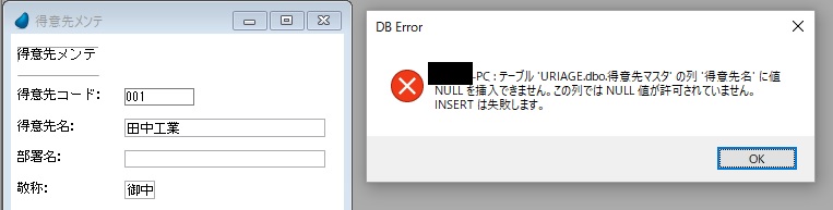 得意先名が入力されているのに列にNULLのエラーが出るということは