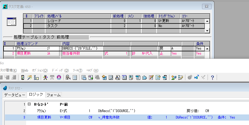 項目更新 件数把握変数 式=DbRecs(’3'DSource,'')とする事が多いです。 -