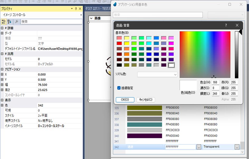 基本色定義:背景 → システム色:未選択、透過指定:チェック有