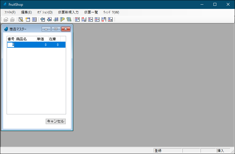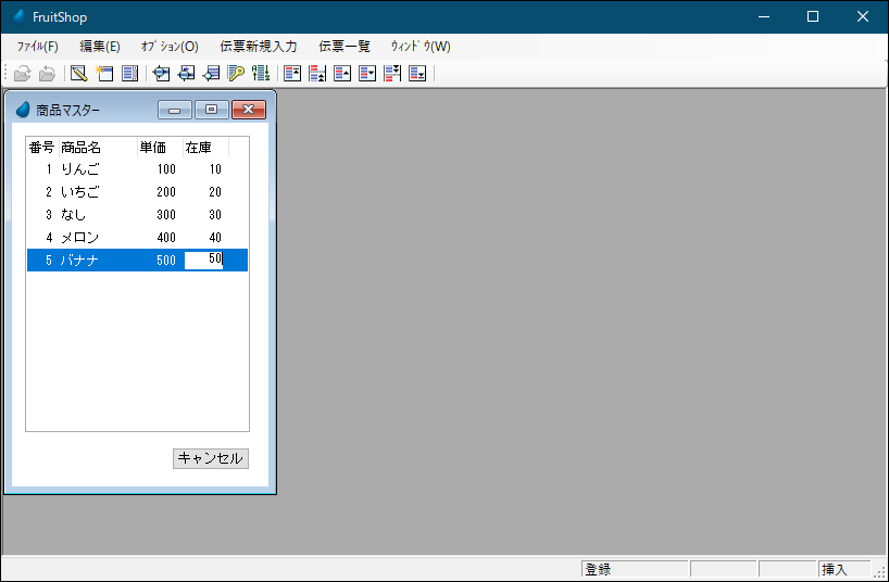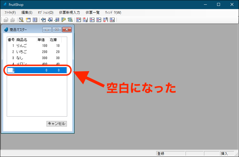 そして、5件目を入力し終えたところで「キャンセル」ボタンを押してみます。すると、5件目のバナナだけが入力が取り消され、元の空白行に戻ります(画面3)。