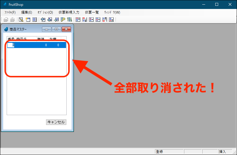 これが、Magicのデフォルトのトランザクションの動作です。つまり、最後に入力された1件のレコードだけが、入力が取り消され、ロールバックして元の空白に戻ったという動きです(詳細はこのあと解説します)。