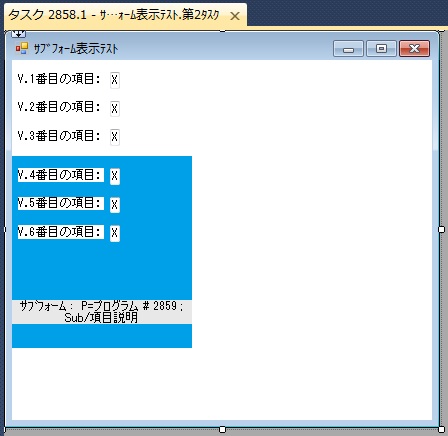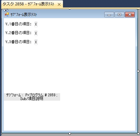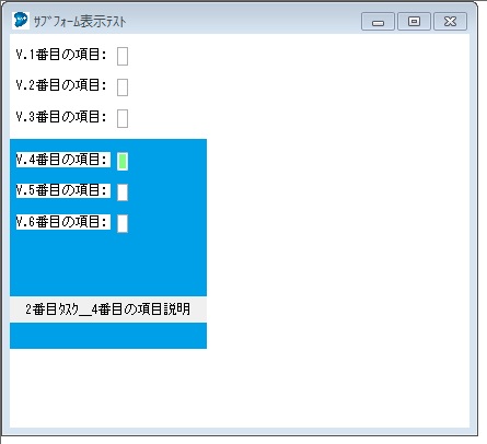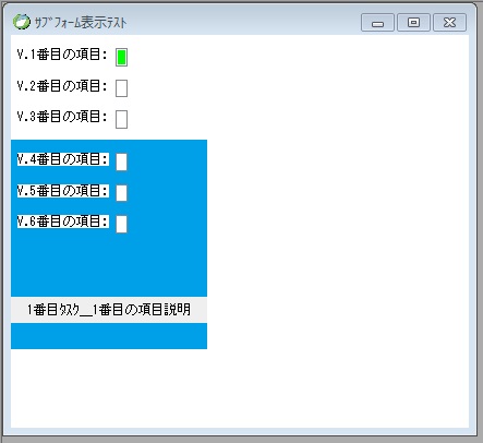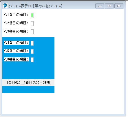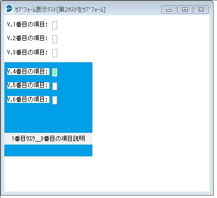 呼出された2番目タスクのフォームは更に上に重ねて表示されるので、2番目タスクのフォーム内の項目説明サブフォームも表示されます。2番目タスクを終了すると2番目タスクのフォームが消えるので、その下にあった2番目タスクサブフォームや1番目タスクの項目説明サブフォームが見えてきます。