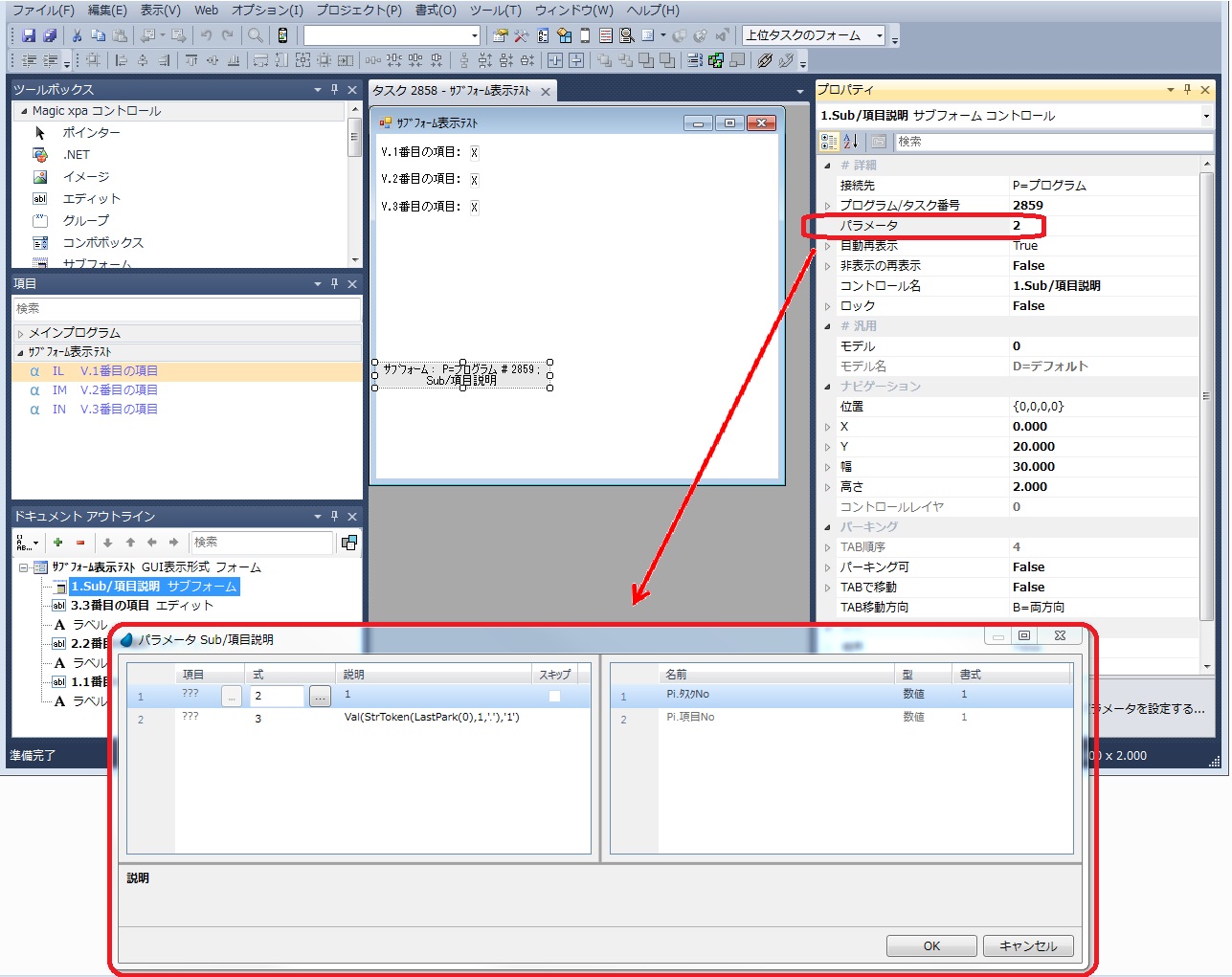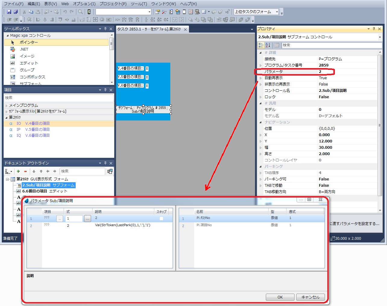 接続先は、項目説明表示用のプログラム番号を設定し、パラメータに「タスクの階層番号、項目番号」を設定しております。