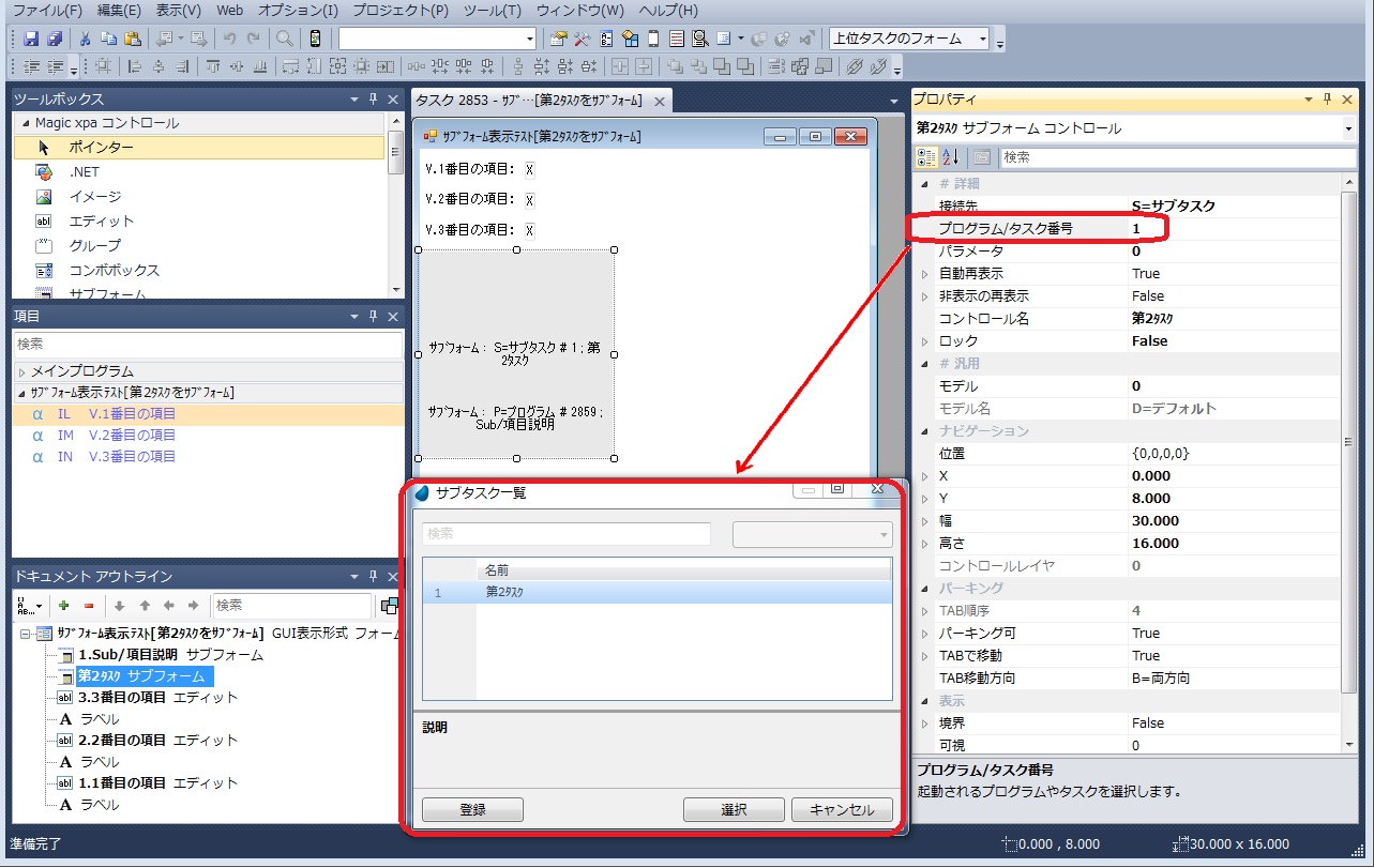 1番目のタスクでは、操作説明のサブフォームコントロール名「1.Sub/操作説明」を設定し、2番目のタスクでは、操作説明のサブフォームコントロール名「2.Sub/操作説明」を設定してますので、間違ってないと思います。
