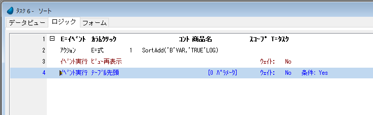 そういうことでしたら、一度、プルダウンメニューからのソート実行を試してみてください。タスクを実行した状態で、プルダウンメニューの「オプション」→「ソート」で「商品CD」を指定します。