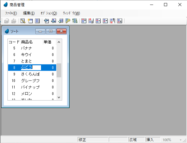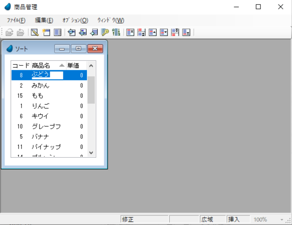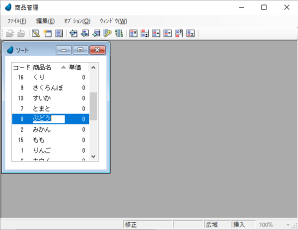 ●ソート後の画面(ソートされて「ぶどう」がテーブルの先頭行に表示)