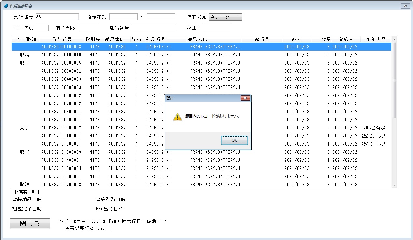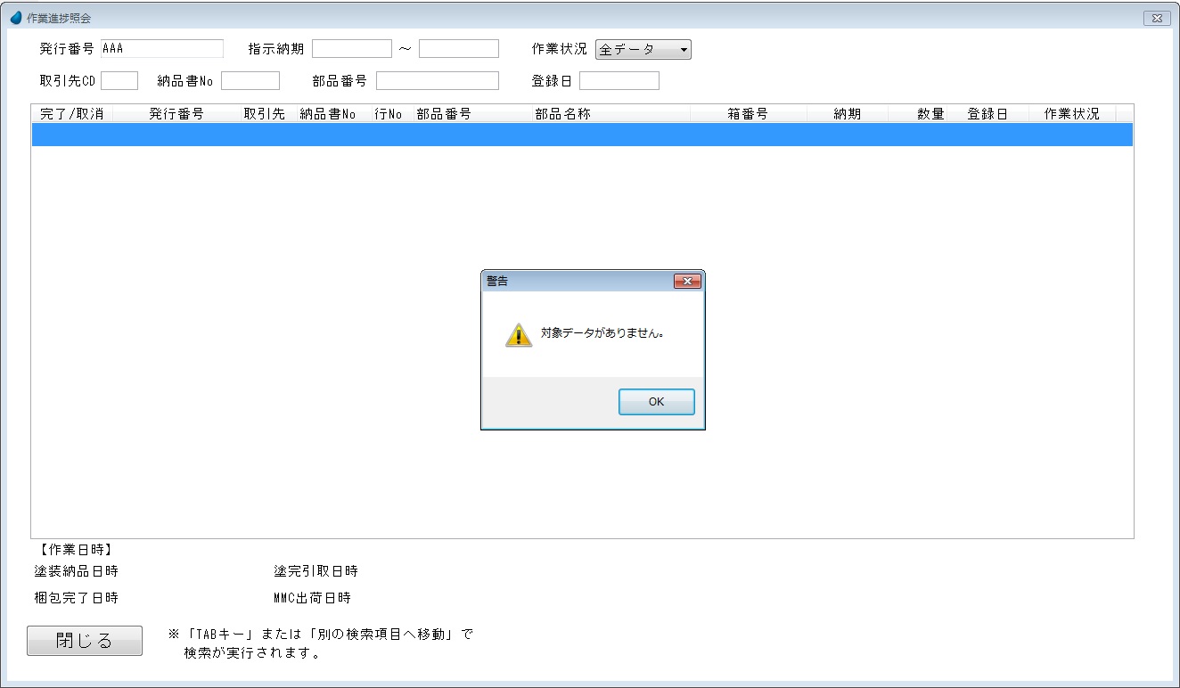 データが存在しなかった場合「範囲内のレコードがありません」と表示され